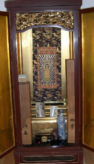 religions. A Buddhist alter with a scroll picture of Buddha and