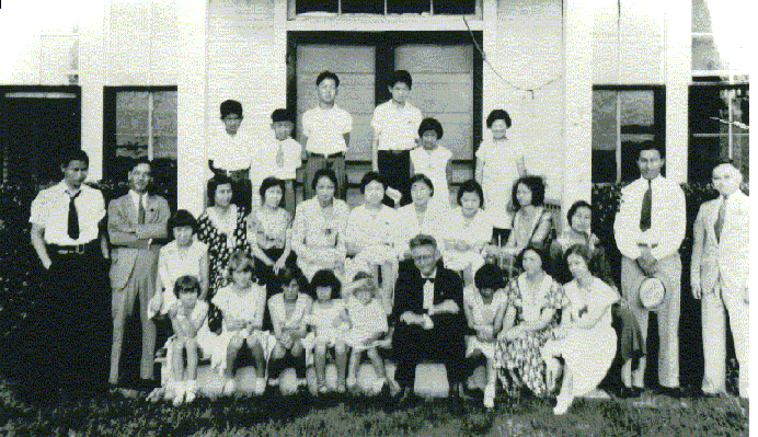 Kishi Colony residents and minister posed on porch of the Terry Methodist Chapel, ca. late 1920's [The UT Institute of Texan Cultures at San Antonio, courtesy of J. Nagai Family] Far left: Yochi Kishi and Tokuzo Hirasaki |