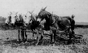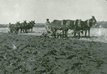 | Mules on Kishi Colony | Farmers plowing field, Kishi Colony [The UT Institute of Texan Cultures at San Antonio, courtesy of J. Nagai Family] |