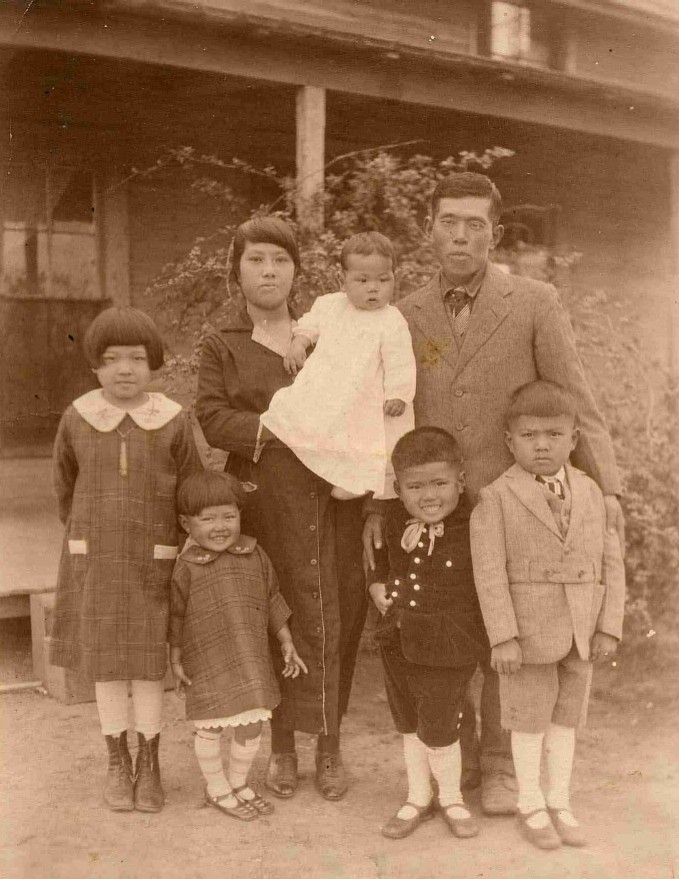| Mitsutaro and Moto Kobayashi family. Riki in Moto's arms. Children from left, Hope, Lily, Ty (father of John and Kathy), and Tokuye | |